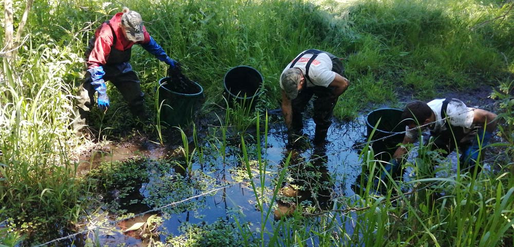 Des filets de protection sont disposés en amont et en aval de chaque chantier pour stopper les boutures et les fragments de tiges en transit qui sont ramassés en fin d’intervention.